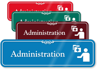 Administration department in any hospital should be well-marked. Install any of these Administration Door Signs to help visitors find their way without losing any time. Signs with symbols make your message comprehensible by multicultural visitors.