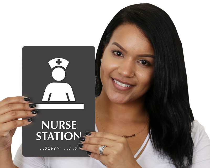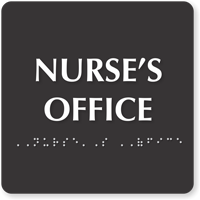 • • Braille signs help the visually challenged identify the nurse's room correctly. Grade II Braille complies with ADA and California regulations.
